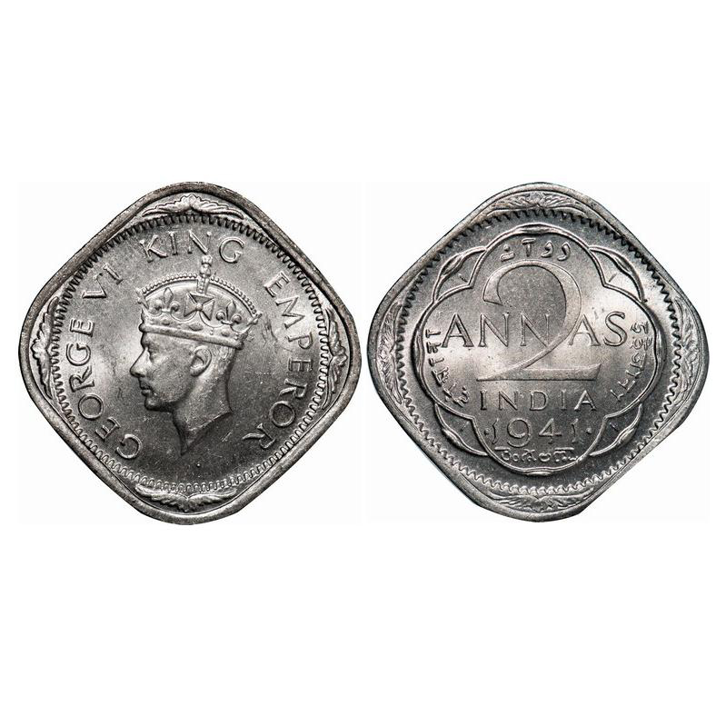 George VI, Copper-Nickel, 2 Annas, 1941, Bombay Mint, Head Type II, Dots by year. GK 1355. Mint Grade. Very Scarce.