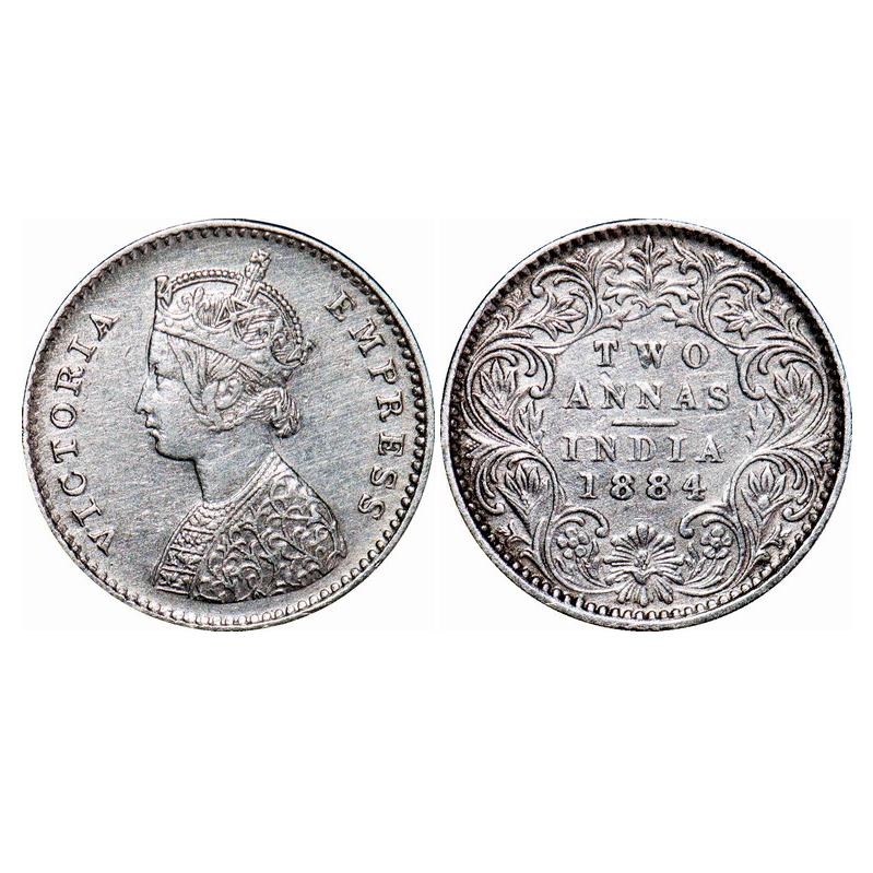 Victoria Empress, Silver, 2 Annas, 1884, Bombay Mint, A/I, No dot. GK 769. Extremely Fine+. Very Scarce.