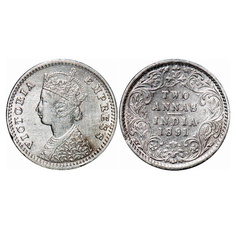 Victoria Empress, Silver, 2 Annas, 1891, Bombay Mint, B/II, 'B' incused. GK 794. Very Fine+. Scarce.