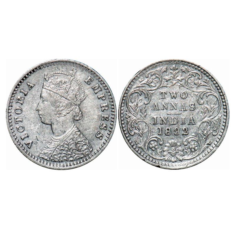 Victoria Empress, Silver, 2 Annas, 1892, Bombay Mint, B/II, 'B' incused. GK 796. Almost Uncirculated. Very Scarce.