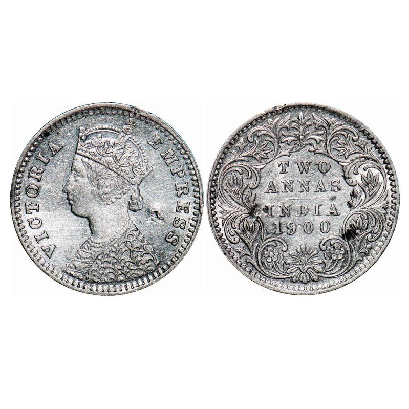 Victoria Empress, Silver, 2 Annas, 1900, Bombay Mint, B/I, 'B' raised, Chisel mark on Rev which is seen prominently on Obv. GK 812. About Uncirculated. Very Scarce.