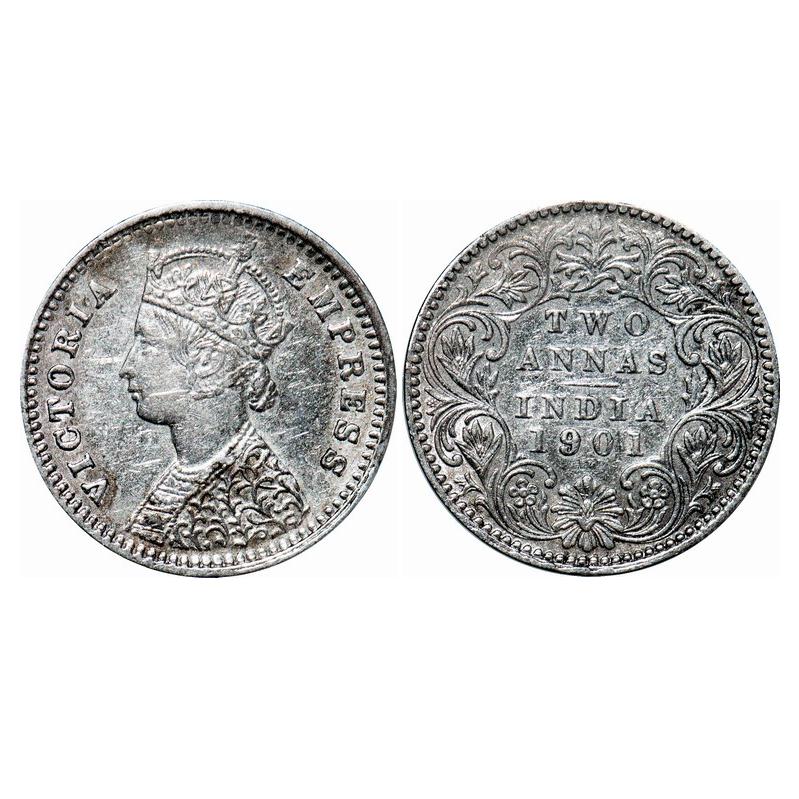 Victoria Empress, Silver, 2 Annas, 1901, Bombay Mint, B/I, 'B' incused. GK 816. Extremely Fine+. Very Scarce.