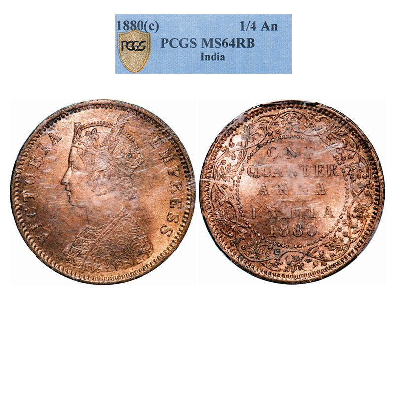 Victoria Empress, Copper, Quarter Anna, 1880, Calcutta Mint, B/II, 'C' incused. GK 833. PCGS Slabbed MS 64 RB. Rare.