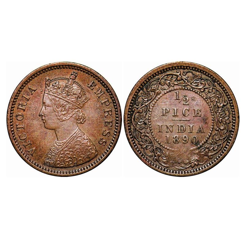 Victoria Empress, Copper, 1/2 Pice, 1890, Calcutta Mint, A/I, No mint mark, die filled inner beaded circle on Rev. GK 870. About Uncirculated. Very Scarce.