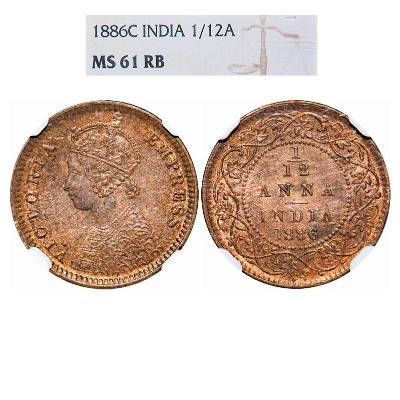 Victoria Empress, Copper, 1/12 Anna, 1886, Calcutta Mint, Obv B, 'C' incused. GK 902. NGC Slabbed MS 61 RB. Rare.