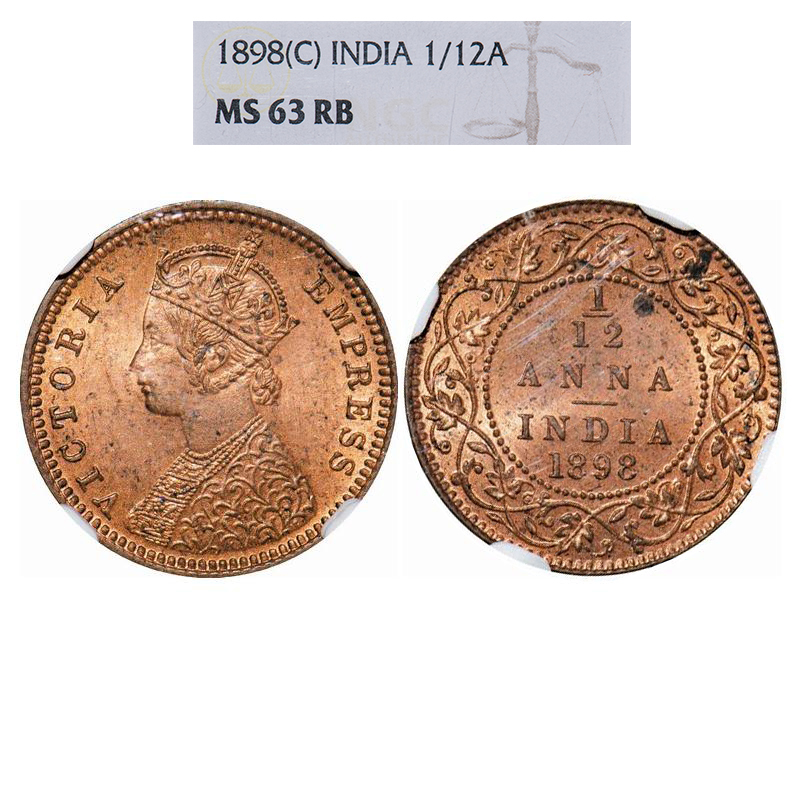Victoria Empress, Copper, 1/12 Anna, 1898, Calcutta mint, Obv B, No mint mark. GK 919. NGC Slabbed MS 63 RB. Rare.