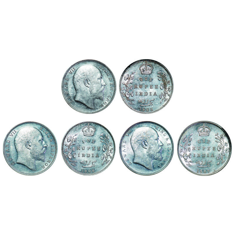 | Edward VII, Silver, Rupee, (3 coins), 1) 1905, Bombay Mint, 'B' incused and dot, Top stroke of numeral 5 long, 2) 1906, Bombay Mint, 'B' incused and dot, 3) 1907, Calcutta Mint, No mint mark. GK 936, 940, 942. Uncirculated to Brilliant Uncirculated. Scarce a s a lot. |