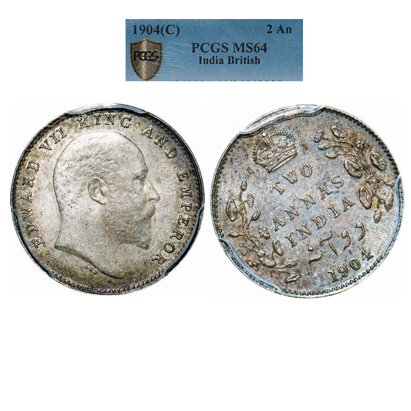 Edward VII, Silver, 2 Annas, 1904, Calcutta Mint, No mint mark, 11 o'clock die rotation on Rev. GK 981. PCGS Slabbed MS 64. Rare.