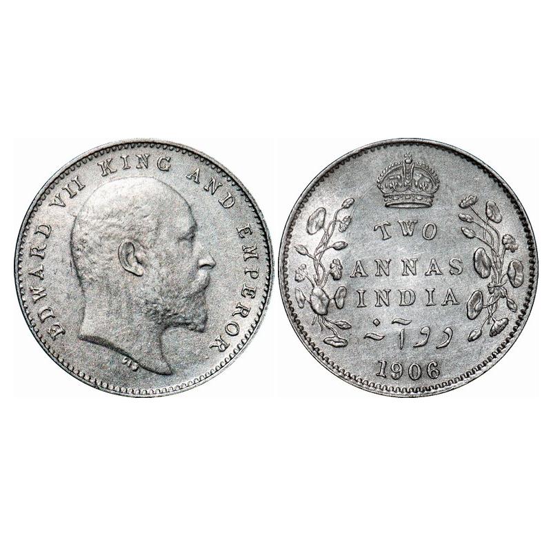 Edward VII, Silver, 2 Annas, 1906, Calcutta Mint, No mint mark. GK 983. Almost Uncirculated. Scarce.