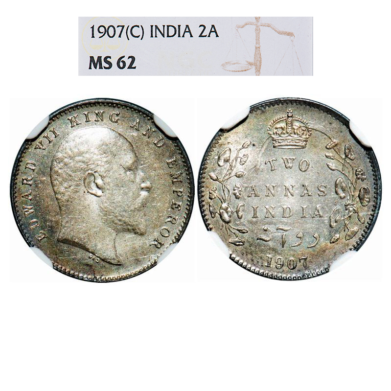 Edward VII, Silver, 2 Annas, 1907, Calcutta Mint, No mint mark. GK 984. NGC Slabbed MS 62. Rare.