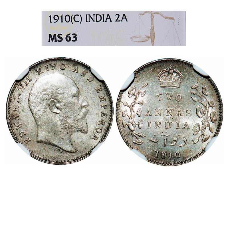 Edward VII, Silver, 2 Annas, 1910, Calcutta Mint, No mint mark. GK 987. NGC Slabbed MS 63. Rare.