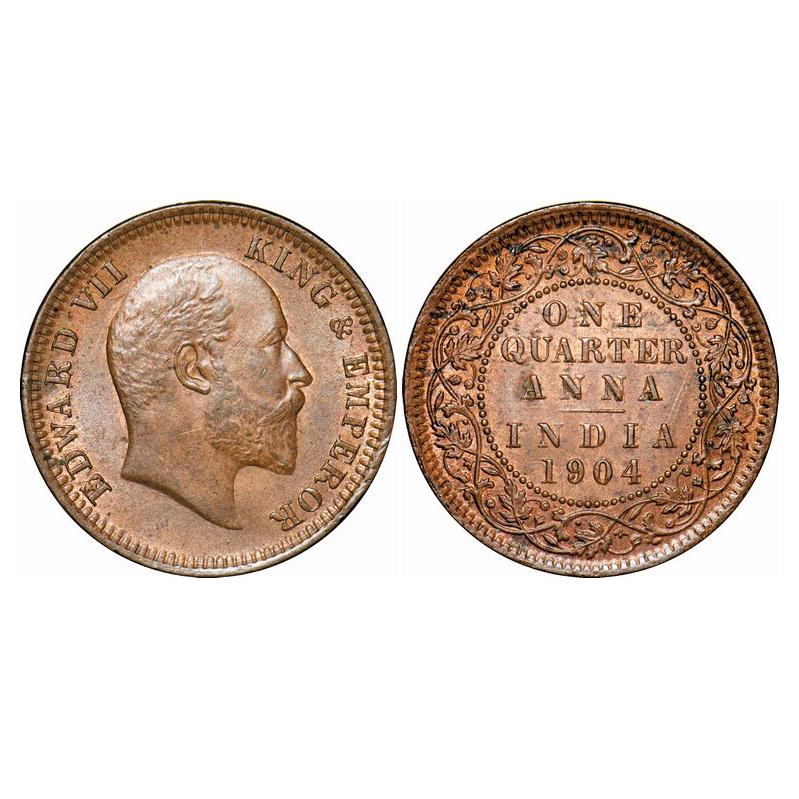 Edward VII, Copper, Quarter Anna, 1904, Calcutta Mint, No mint mark, Ghost on Rev. GK 995. Uncirculated. Scarce.