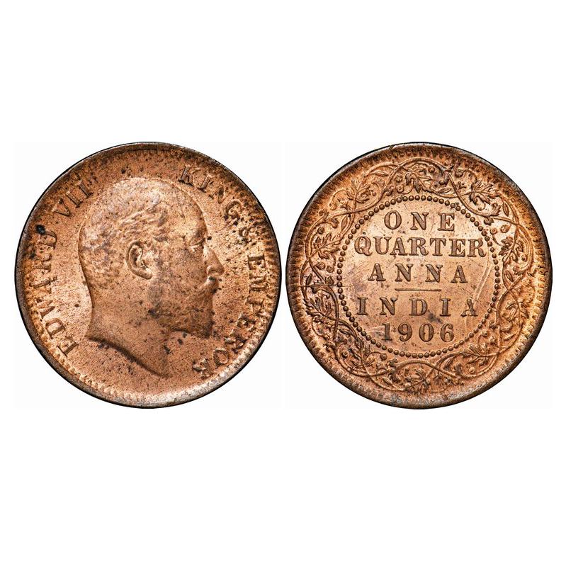 Edward VII, Copper, Quarter Anna, 1906, 6.40g, Calcutta Mint, No mint mark, Ghost on Rev. GK 997. Uncirculated. Scarce.