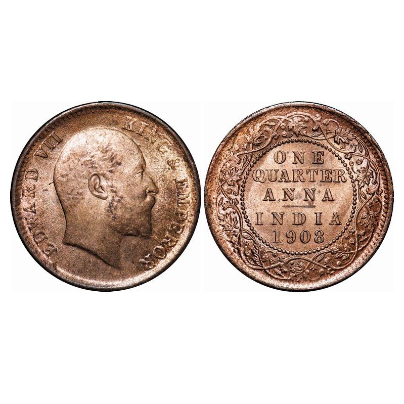 Edward VII, Bronze, Quarter Anna, 1908, Calcutta Mint, No mint mark, Multiple die cracks on Obv. GK 1000. Brilliant Uncirculated. Very Scarce.