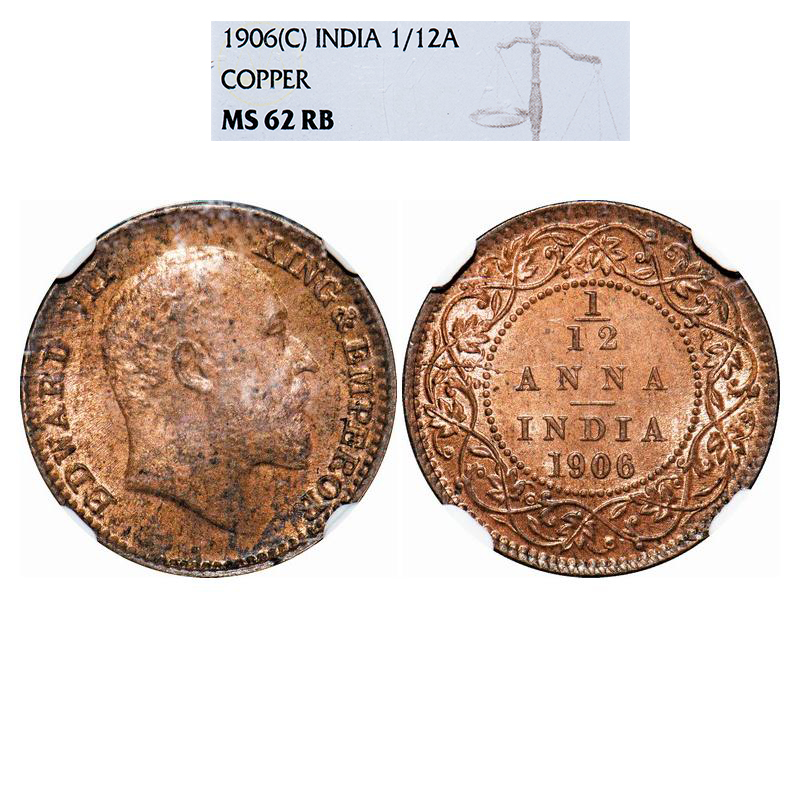 Edward VII, Copper, 1/12 Anna, 1906, Calcutta mint, No mint mark. GK 1015. NGC Slabbed MS 62 RB. Rare.