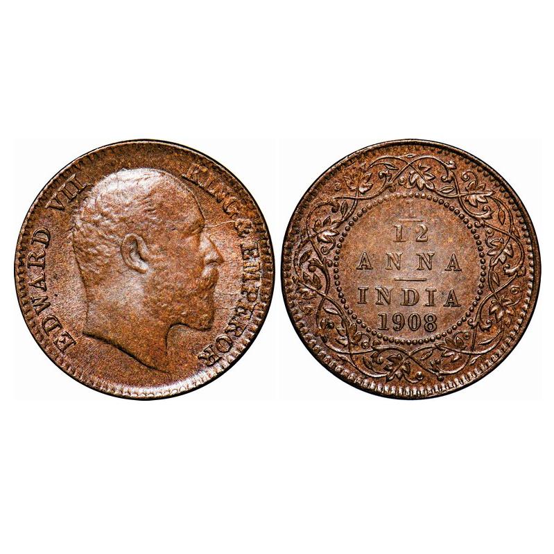 Edward VII, Bronze, 1/12 Anna, 1908, Calcutta Mint, No mint mark, Multiple die cracks on Obv. GK 1018. Uncirculated. Scarce.