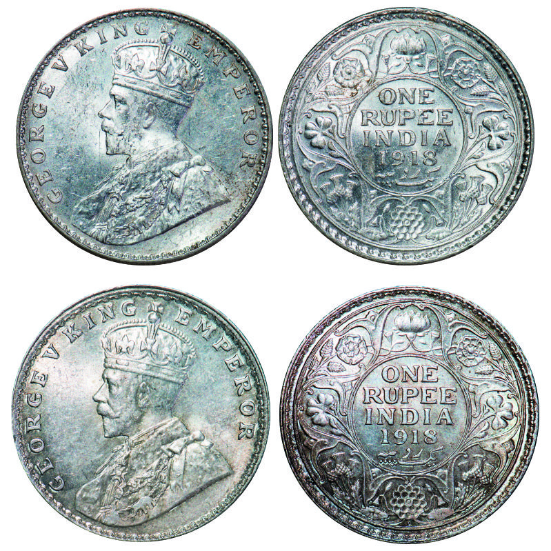 | George V, Silver, Rupee, (2 coins), 1918, Die crack on Rev, 1) Calcutta Mint, No dot, 2) Bombay Mint, Dot. GK 1037, 1038. Mint State. Very Scarce. |