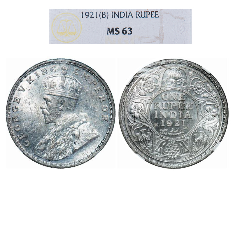 George V, Silver, Rupee, 1921, Bombay Mint, Dot. GK 1043. NGC Slabbed MS 63. Very Scarce.