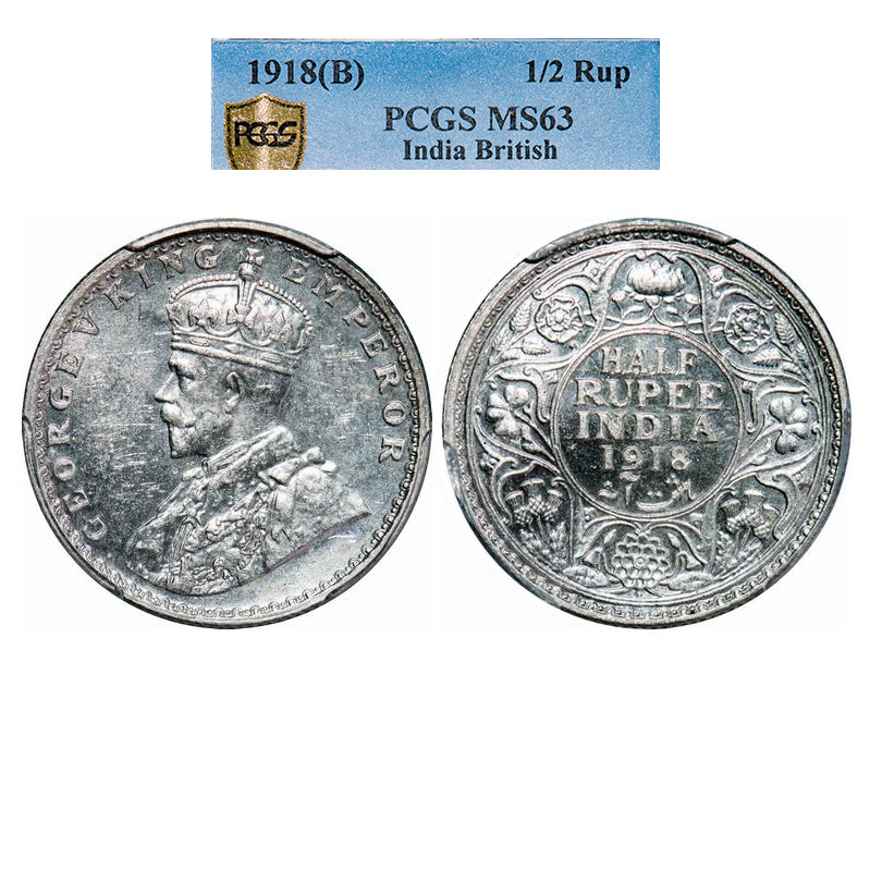 George V, Silver, Half Rupee, 1918, Bombay Mint, Dot. GK 1056. PCGS Slabbed MS 63. Rare.