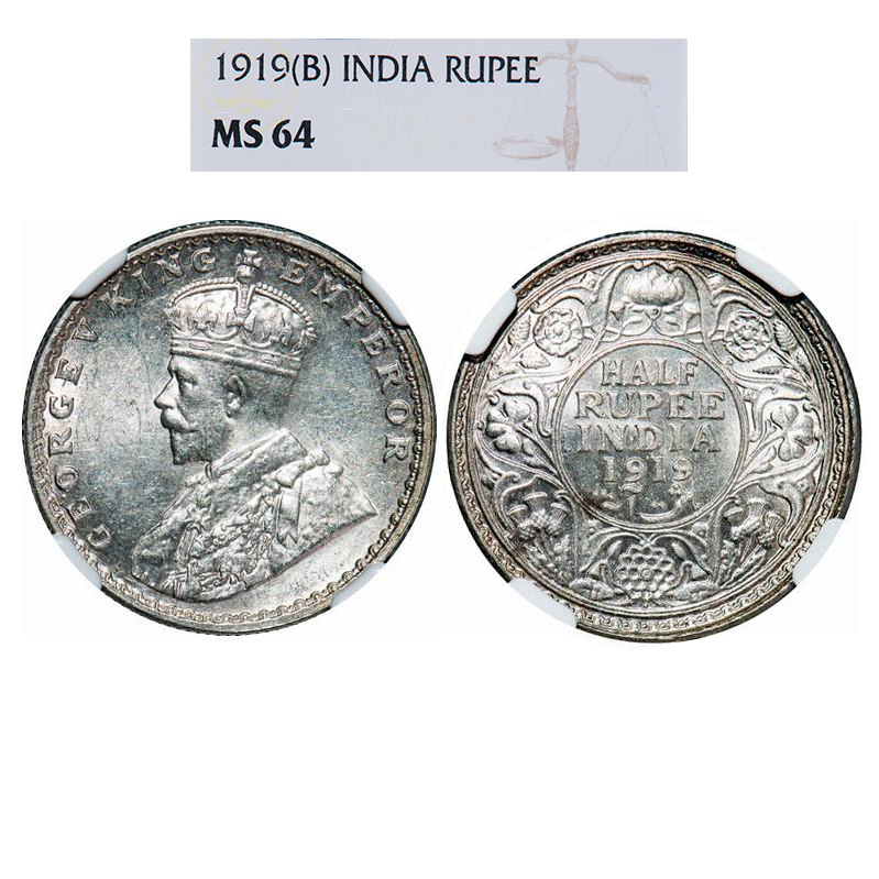 George V, Silver, Half Rupee, 1919, Bombay Mint, Dot. GK 1057. NGC Slabbed MS 64. Rare.