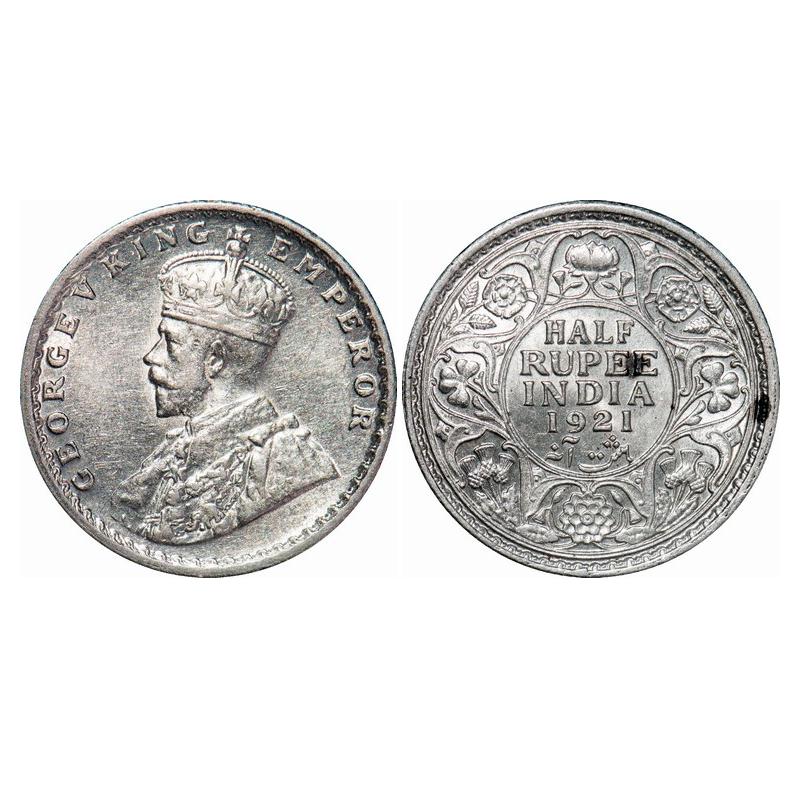 Geroeg V, Silver, Half Rupee, 1921, Calcutta Mint, No dot. GK 1058. About Uncirculated. Scarce.