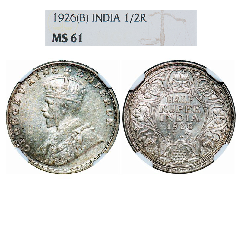 George V, Silver, Half Rupee, 1926, Bombay Mint, Dot. GK 1068. NGC Slabbed MS 61. Rare.