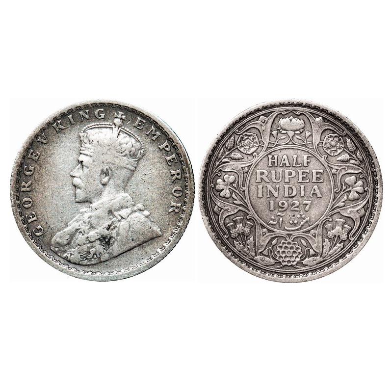 George V, Silver, Half Rupee, 1927, Calcutta Mint, No dot. GK 1069. Very Fine. Scarce.