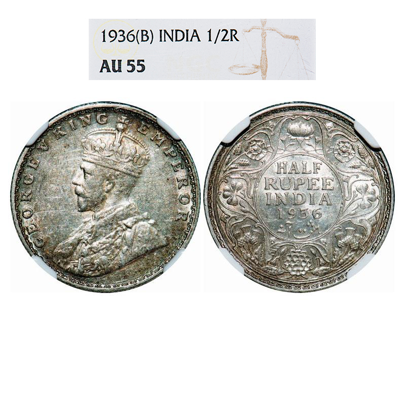 George V, Silver, Half Rupee, 1936, Bombay Mint, Dot. GK 1076. NGC Slabbed AU 55. Scarce.
