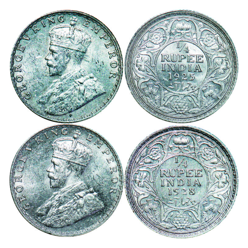 | George V, Silver, 1/4 Rupee, (2 coins), 1925, 1928, Bombay Mint, Dot. GK 1093, 1095. Brilliant Uncirculated. Very Scarce. |