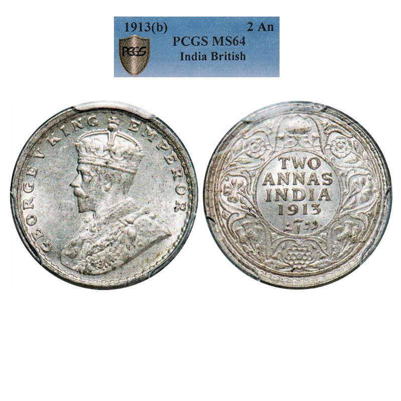 George V, Silver, 2 Annas, 1913, Bombay Mint, Dot. GK 1111. PCGS Slabbed MS 64. Rare.