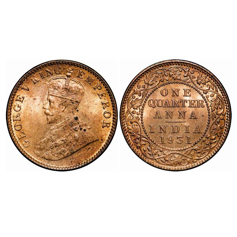 George V, Bronze, Quarter Anna, 1931, Calcutta Mint, No dot. GK 1192. Brilliant Uncirculated. Rare.
