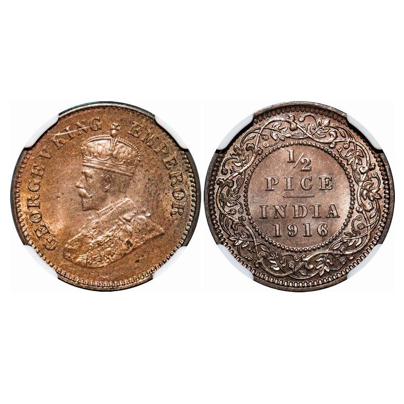 George V, Bronze, 1/2 Pice, 1916, Calcutta Mint, No mint mark. GK 1202. NGC Slabbed MS 63 RB. Rare.