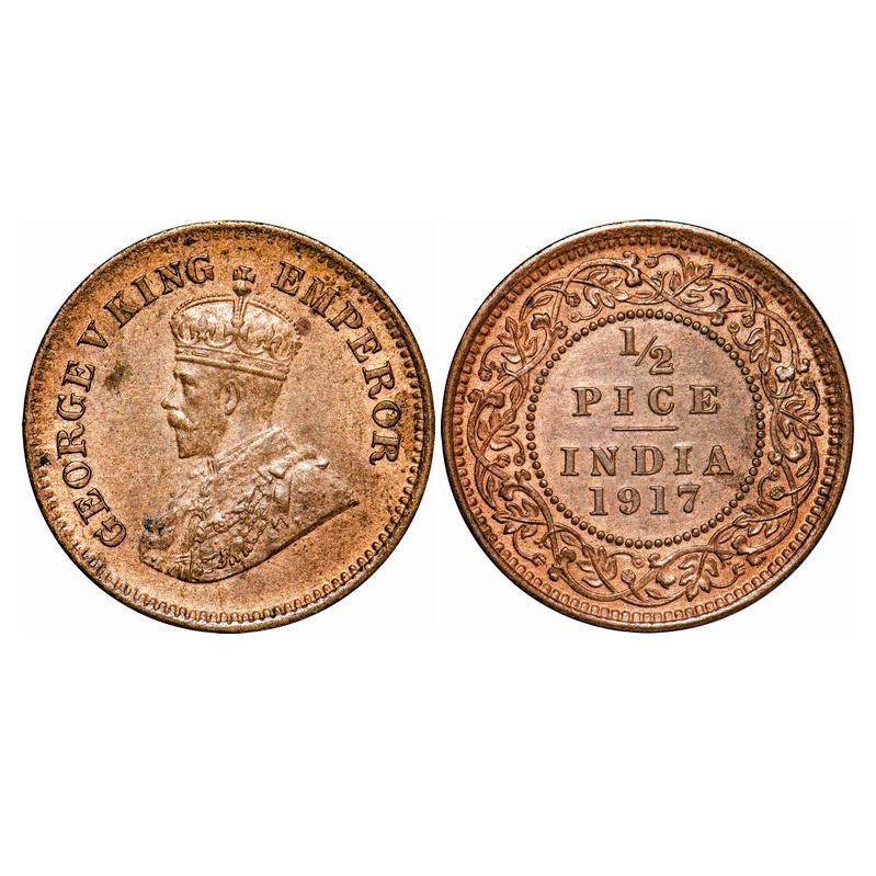 George V, Bronze, 1/2 Pice, 1917, Calcutta Mint, No mint mark. GK 1203. Mint State. Rare.