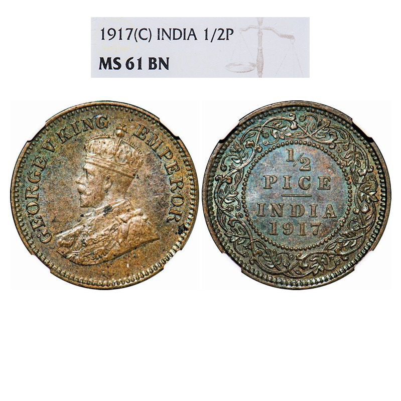 George V, Bronze, 1/2 Pice, 1917, Calcutta Mint, No mint mark. GK 1203. NGC Slabbed MS 61 BN. Rare.