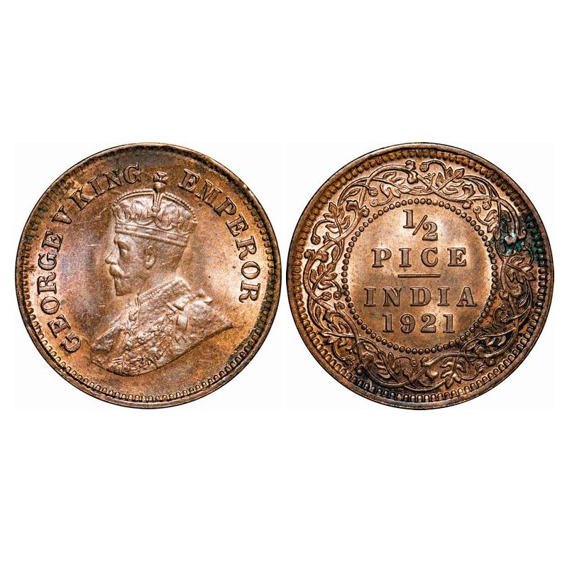 George V, Bronze, 1/2 Pice, 1921, Calcutta Mint, No mint mark. GK 1207. Brilliant Uncirculated. Very Scarce.
