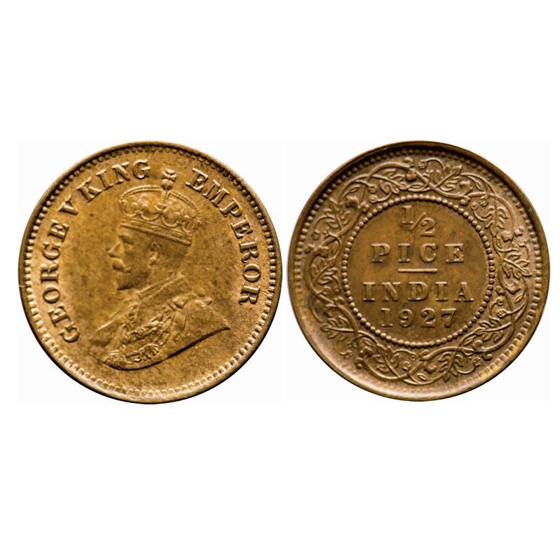 George V, Bronze, 1/2 Pice, 1927, Calcutta Mint, No mint mark. GK 1213. Uncirculated. Very Scarce.