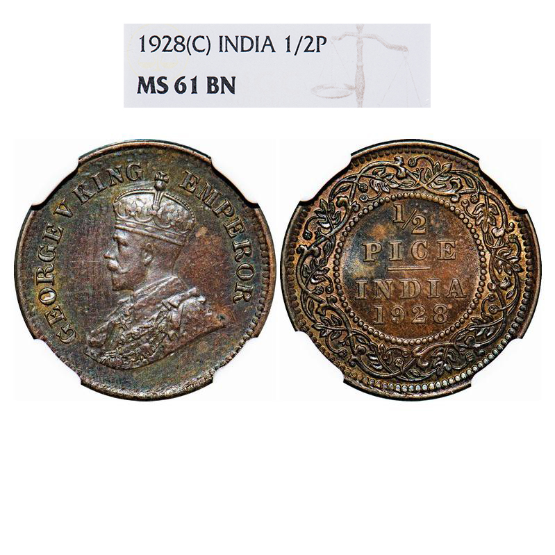 George V, Bronze, 1/2 Pice, 1928, Calcutta Mint, No mint mark. GK 1214. NGC Slabbed MS 61 BN. Rare.