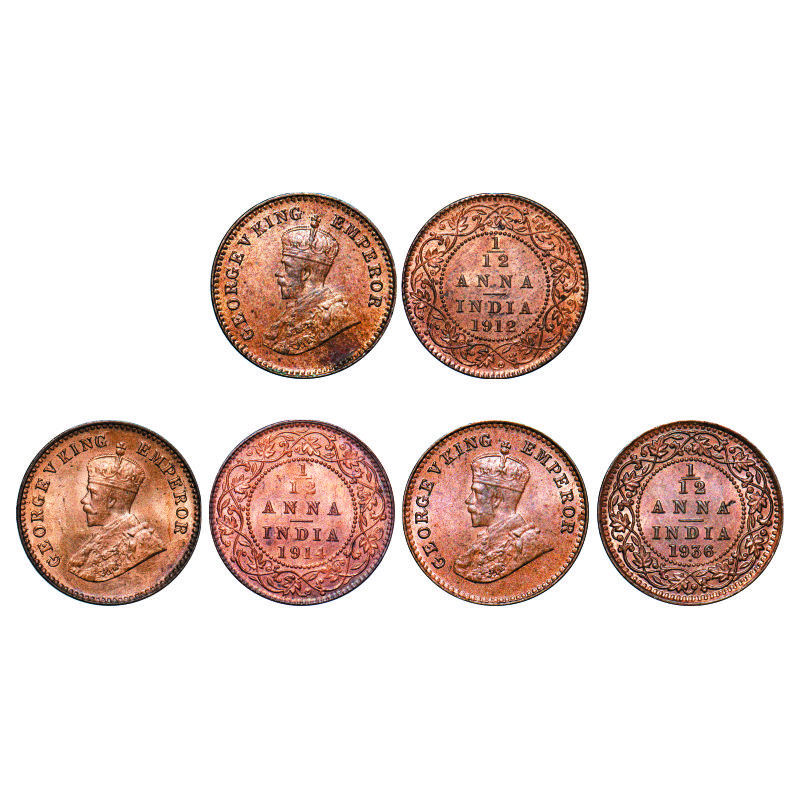 | George V, Bronze, 1/12 Anna, (3 coins), 1) 1912, Calcutta Mint, No dot, 2) 1914, Calcutta Mint, No dot, 3) 1936, Bombay Mint, Dot. GK 1223, 1225, 1252. Mint State. Very Scarce. |