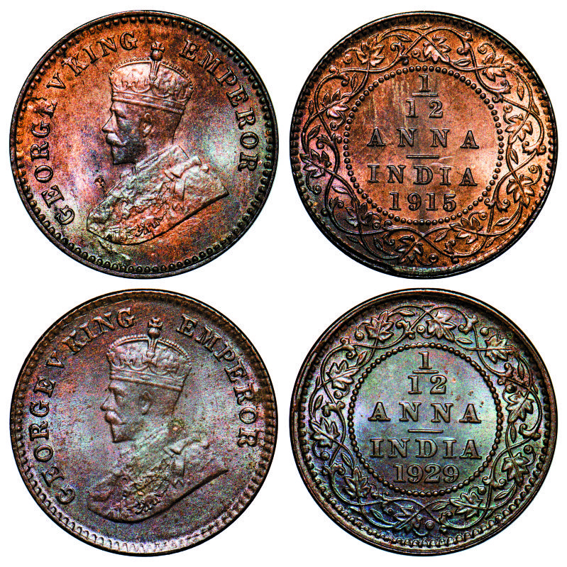 | George V, Bronze, 1/12 Anna, (2 coins), Calcutta Mint, No dot, 1) 1915, 2 Planchet flaw on Obv, 2) 1929, Rainbow Toned. GK 1226, 1245. Mint State. Scarce. |