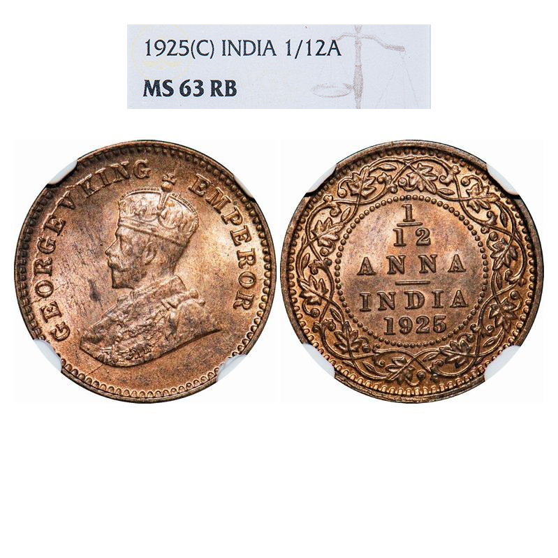 George V, Bronze, 1/12 Anna, 1925, Calcutta Mint, No dot. GK 1238. NGC Slabbed MS 63 RB. Very Scarce.