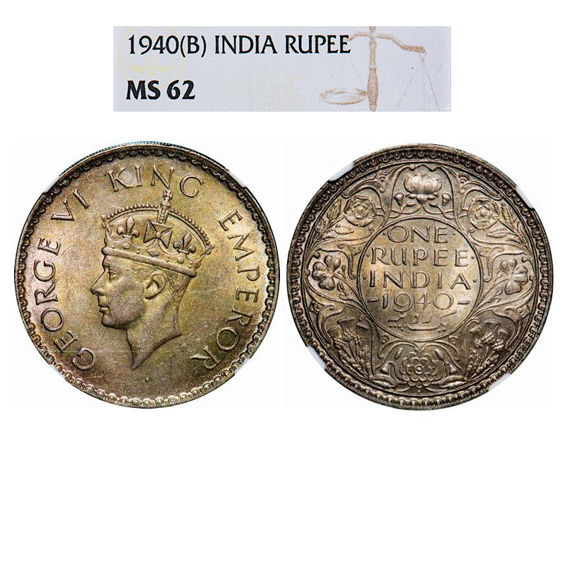 | George VI, Half Silver, Rupee, 1940, Bombay Mint, A(a)/I, Dot, Security edge, Boarder teeth design is shorter and bolder and dot mm is not aligned with short tooth. GK 1258. NGC Slabbed MS 62. Rare. |