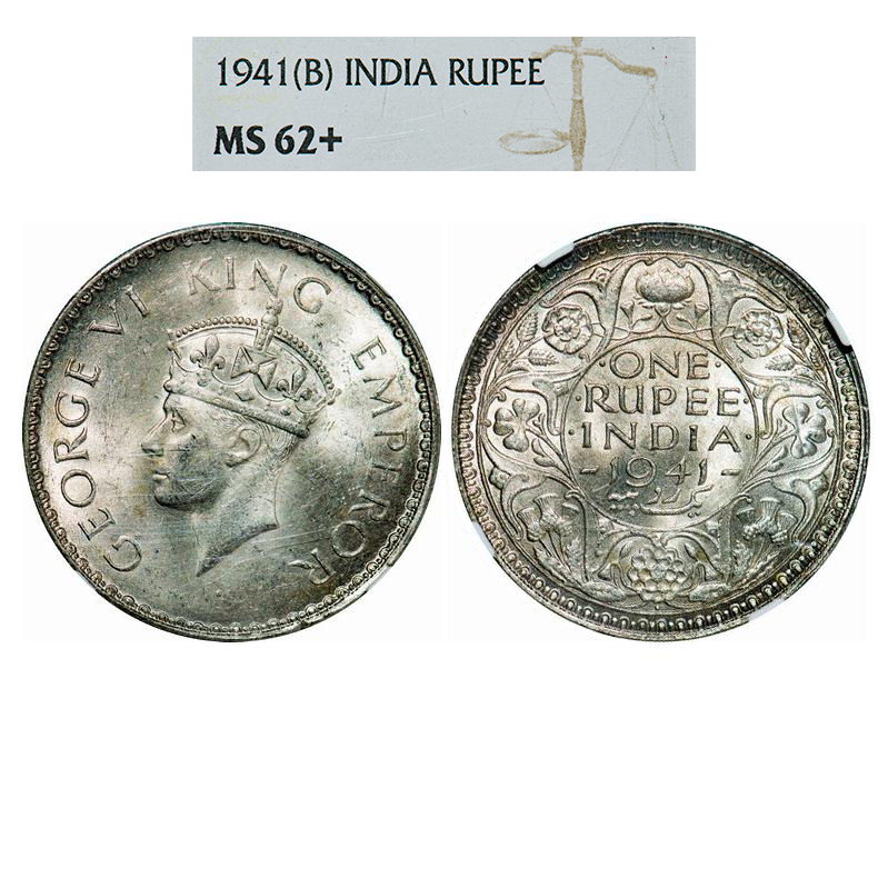 George VI, Half Silver, Rupee, 1941, Bombay Mint, A(a)/I, Dot, Security edge. GK 1261. NGC Slabbed MS 62+. Rare.