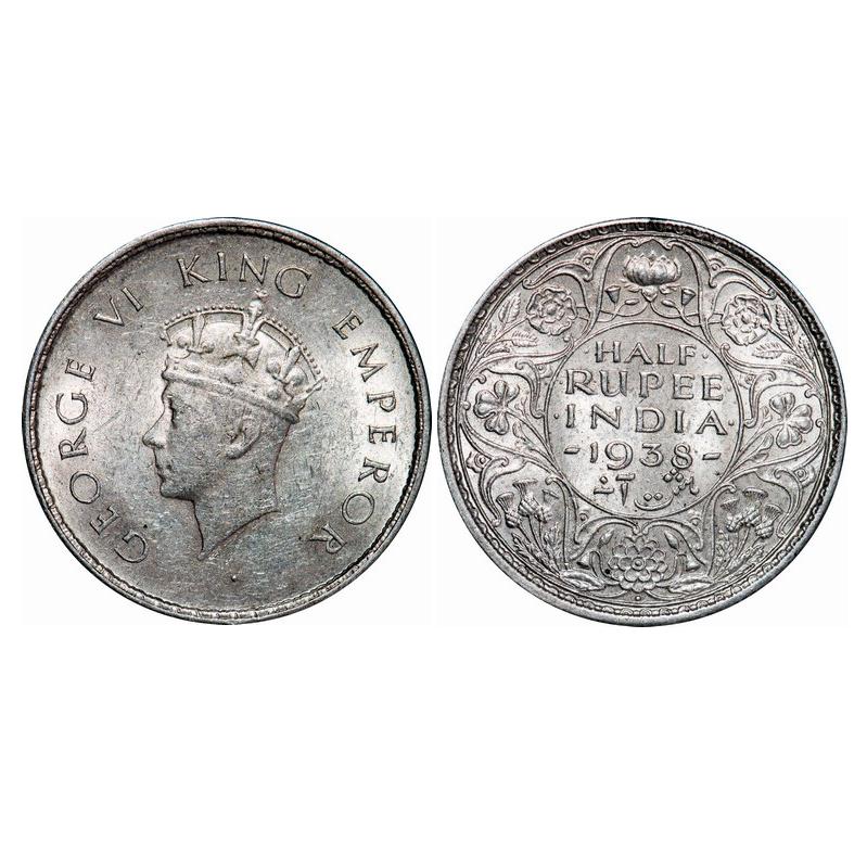 | George VI, Silver, Half Rupee, 1938, Bombay Mint, A/I, Head Type I, Dot, Milled edge, Few diamond shape pyramis on Obv and Rev. GK 1294. Almost Uncirculated. Scarce. |
