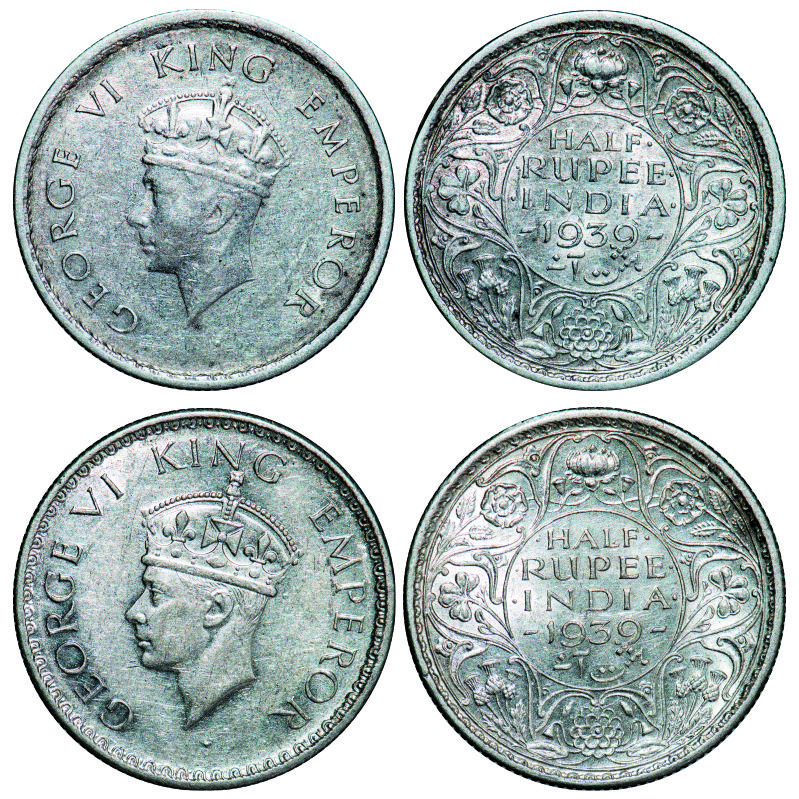 | George VI, Silver, Half Rupee, 1939, (2 coins), 1939, Calcutta Mint, No dot, Milled edge, 1) Head Type I, A/I, 2) Head Type II, A(a)/I. GK 1297, 1298. Almost Uncirculated to Uncirculated. Scarce. |