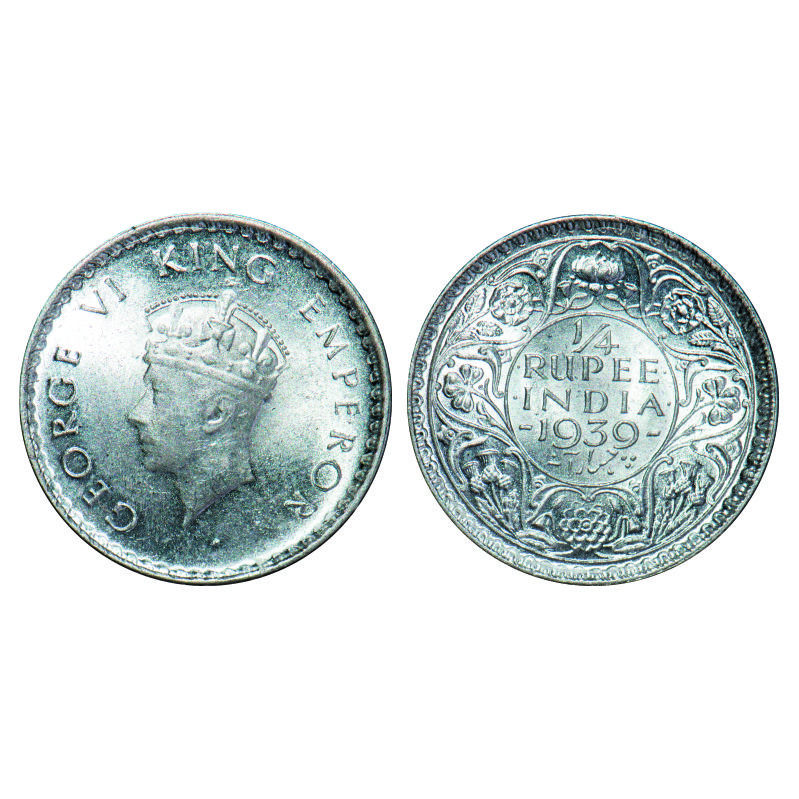 | George VI, Silver, 1/4 Rupee, 1939, Calcutta mint, head Type I, Rev 1, No dot, Milled edge, Tiny diamond shape pyramis on Rev. GK 1325. Brilliant Uncirculated. Scarce. |