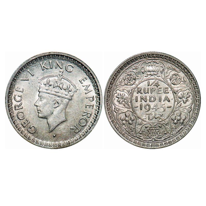 | George VI, Half Silver, 1/4 Rupee, 1945, Bombay Mint, Head Type II, Rev II, Dot, Security edge, Large 5. GK 1343. About Uncirculated. Very Scarce. |