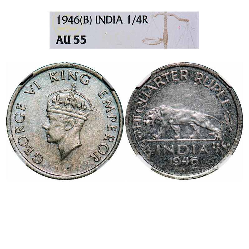 | George VI, Nickel, 1/4 Rupee, 1946, Bombay Mint, Head Type II, Rev IV, Diamond mint mark, Milled edge. GK 1346. NGC Slabbed AU 55. Scarce. |