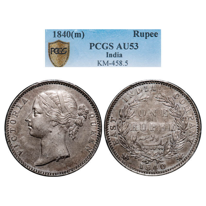 | Victoria Queen, Silver, Rupee, 1840, DL, Madras Mint, W.W.B. raised (dot after B), Wreath with 28 Berries (13L + 15R). GK 176, F. Prid 60. PCGS Slabbed AU 53. Scarce. |