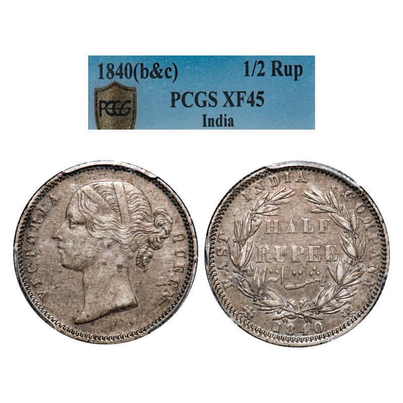 | Victoria Queen, Silver, Half Rupee, 1840, DL, Calcutta Mint, .W.W incused, Wreath with 24 Berries (12L + 12R). GK 188, F. Prid 80. PCGS Slabbed XF 45. Scarce. |