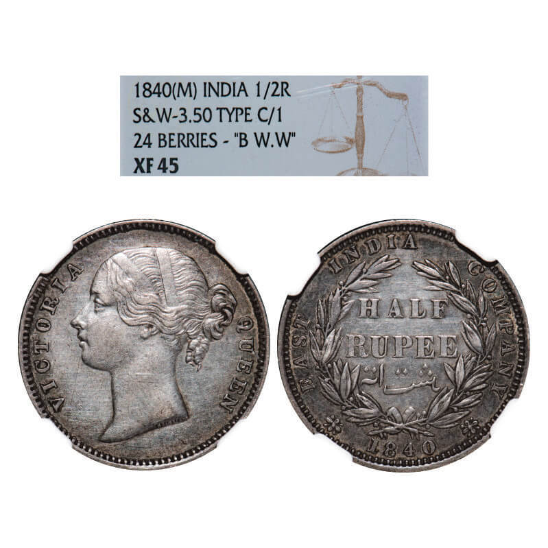 | Victoria Queen, Silver, Half Rupee, 1840, DL, Madras Mint, 'B' raised, W.W. incused, Wreath with 24 Berries (12L + 12R), Initial 'B' often looks like numeral '8'. GK 196, F. Prid Unlisted. NGC Slabbed XF 45. Very Scarce. |
